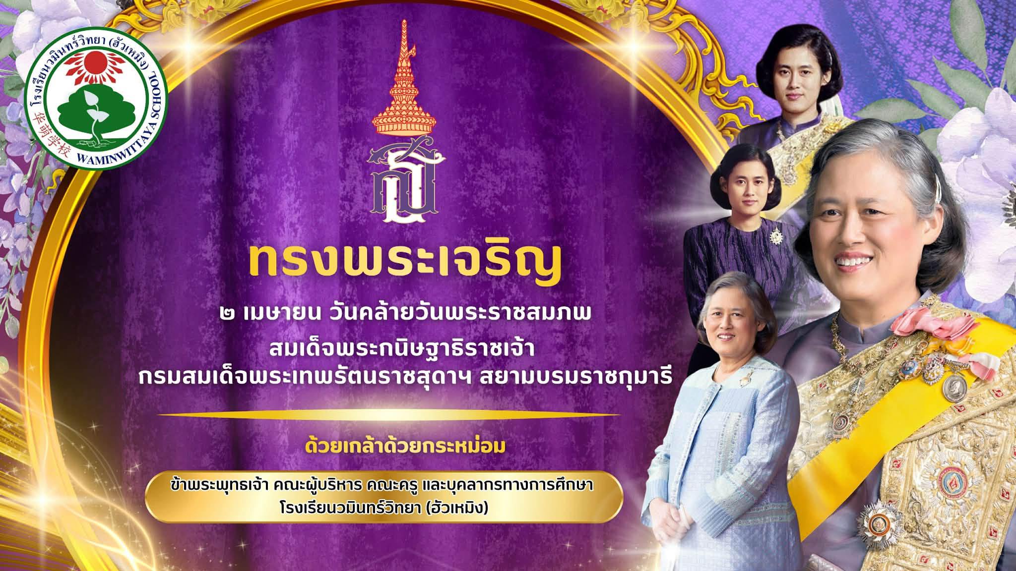 ๒ เมษายน เนื่องในโอกาสวันคล้ายวันพระราชสมภพ -- สมเด็จพระกนิษฐาธิราชเจ้า กรมสมเด็จพระเทพรัตนราชสุดา ฯ สยามบรมราชกุมารี -- ด้วยเกล้าด้วยกระหม่อม ข้าพระพุทธเจ้า คณะผู้บริหาร คณะครู และบุคลากรทางการศึกษา โรงเรียนวมินทร์วิทยา (ฮัวเหมิง)