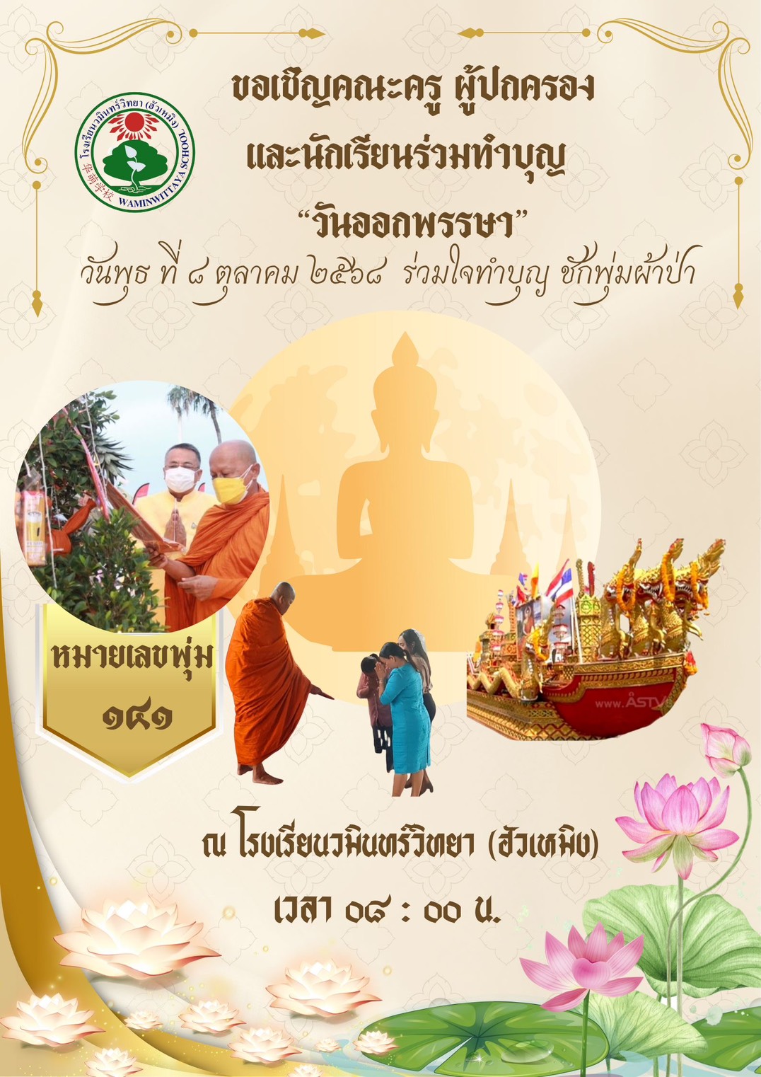 ประกาศจากกลุ่มสาระสังคมศึกษาฯ ขอเชิญคณะครู ผู้ปกครอง และนักเรียนร่วมทำบุญ "วันออกพรรษา" เวลา 08.00 น. วันพุธ ที่ 8 ตุลาคม 2568 ร่วมใจทำบุญ ชักพุ่มผ้าป่า ณ โรงเรียน วมินทร์วิทยา(ฮัวเหมิง)
