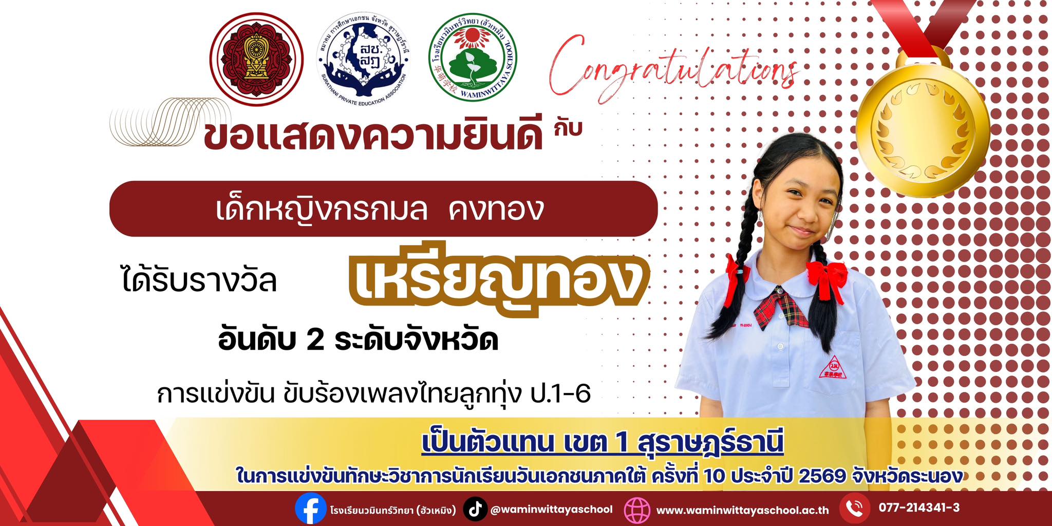 ขอแสดงความยินดีกับ เด็กหญิงกรกมล คงทอง นักเรียนที่ได้รางวัล เหรียญทอง อันดับ 2 ระดับจังหวัด การแข่งขัน ขับร้องเพลงไทยลูกทุ่ง ป.1-6 เป็นตัวแทน เขต 1 สุราษฎร์ธานี ในการแข่งขันทักษะวิชาการนักเรียนวันเอกชนภาคใต้ ครั้งที่ 10 ประจำปี 2569 จังหวัดระนอง