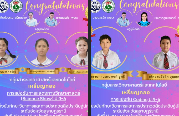 ขอแสดงความยินดีกับ เด็กหญิงกัญญาภัค ศรีสุข เด็กหญิงสิรินภา ทวิชสังข์ เด็กหญิงวลัยลักษณ์ เลิศปรัชญานน์ นักเรียนที่ได้รางวัล เหรียญทอง อันดับ 1 ระดับจังหวัด การแข่งขัน การแสดงทางวิทยาศาสตร์ (Science Show) ป.4-6 เป็นตัวแทน เขต 1 สุราษฎร์ธานี ในการแข่งขันท