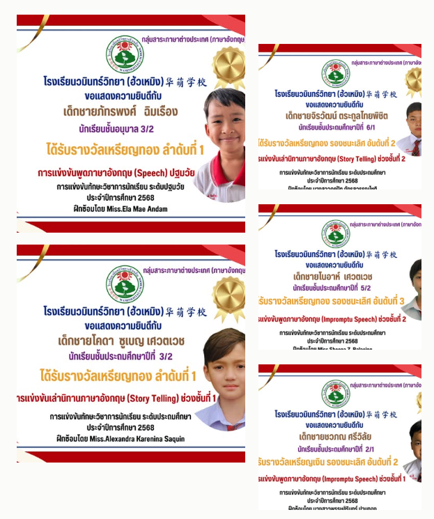 โรงเรียน วมินทร์วิทยา(ฮัวเหมิง) 华萌学校 ขอแสดงความยินดีกับ กลุ่มสาระภาษาต่างประเทศ (ภาษาอังกฤษ) ระดับชั้นประถมศึกษาปีที่ 1-6 ได้รับรางวัลเหรียญทอง เหรียญเงิน และเหรียญทองแดง ในโครงการทดสอบความสามารถทางวิชาการชิงแชมป์สุราษฎร์ธานี ประจำปีการศึกษา 2568