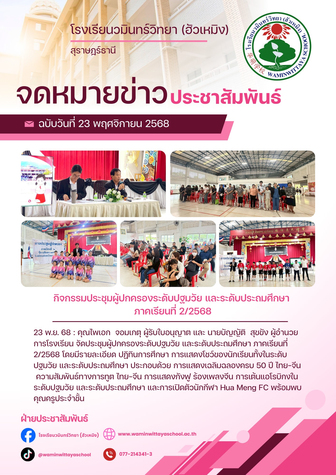 23 พ.ย. 68 : คุณไพเอก จอมเกตุ ผู้รับใบอนุญาต และ นายบัญญัติ สุขขัง ผู้อำนวยการโรงเรียน จัดประชุมผู้ปกครองระดับปฐมวัย และระดับประถมศึกษา ภาคเรียนที่ 2/2568 โดยมีรายละเอียด ปฏิทินการศึกษา การแสดงโชว์ของนักเรียนทั้งในระดับปฐมวัย และระดับประถมศึกษา ประกอบด้