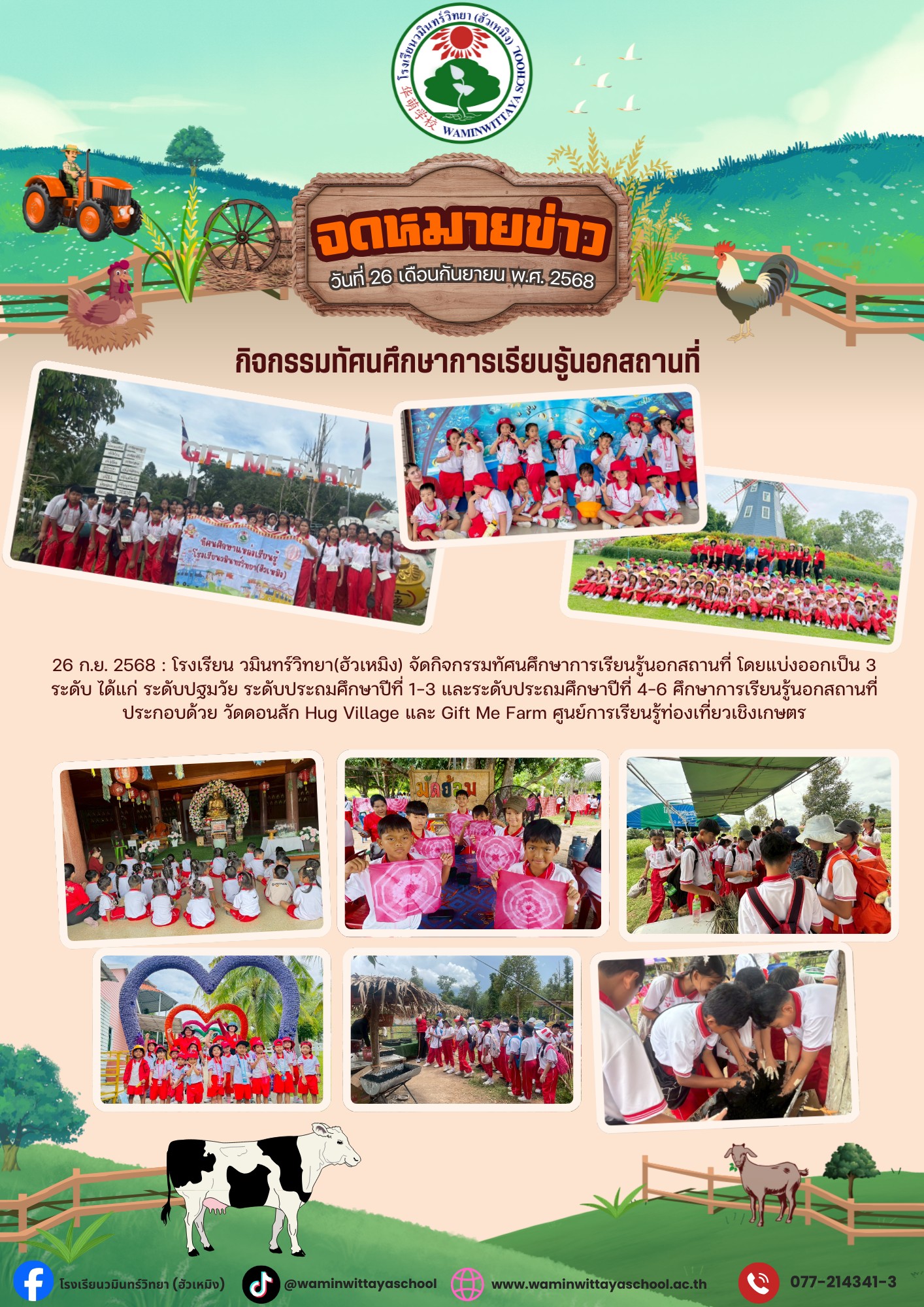 26 ก.ย. 2568 : โรงเรียน วมินทร์วิทยา(ฮัวเหมิง) จัดกิจกรรมทัศนศึกษาการเรียนรู้นอกสถานที่ โดยแบ่งออกเป็น 3 ระดับ ได้แก่ ระดับปฐมวัย ระดับประถมศึกษาปีที่ 1-3 และระดับประถมศึกษาปีที่ 4-6 ศึกษาการเรียนรู้นอกสถานที่ ประกอบด้วย วัดดอนสัก Hug Village และ Gift Me