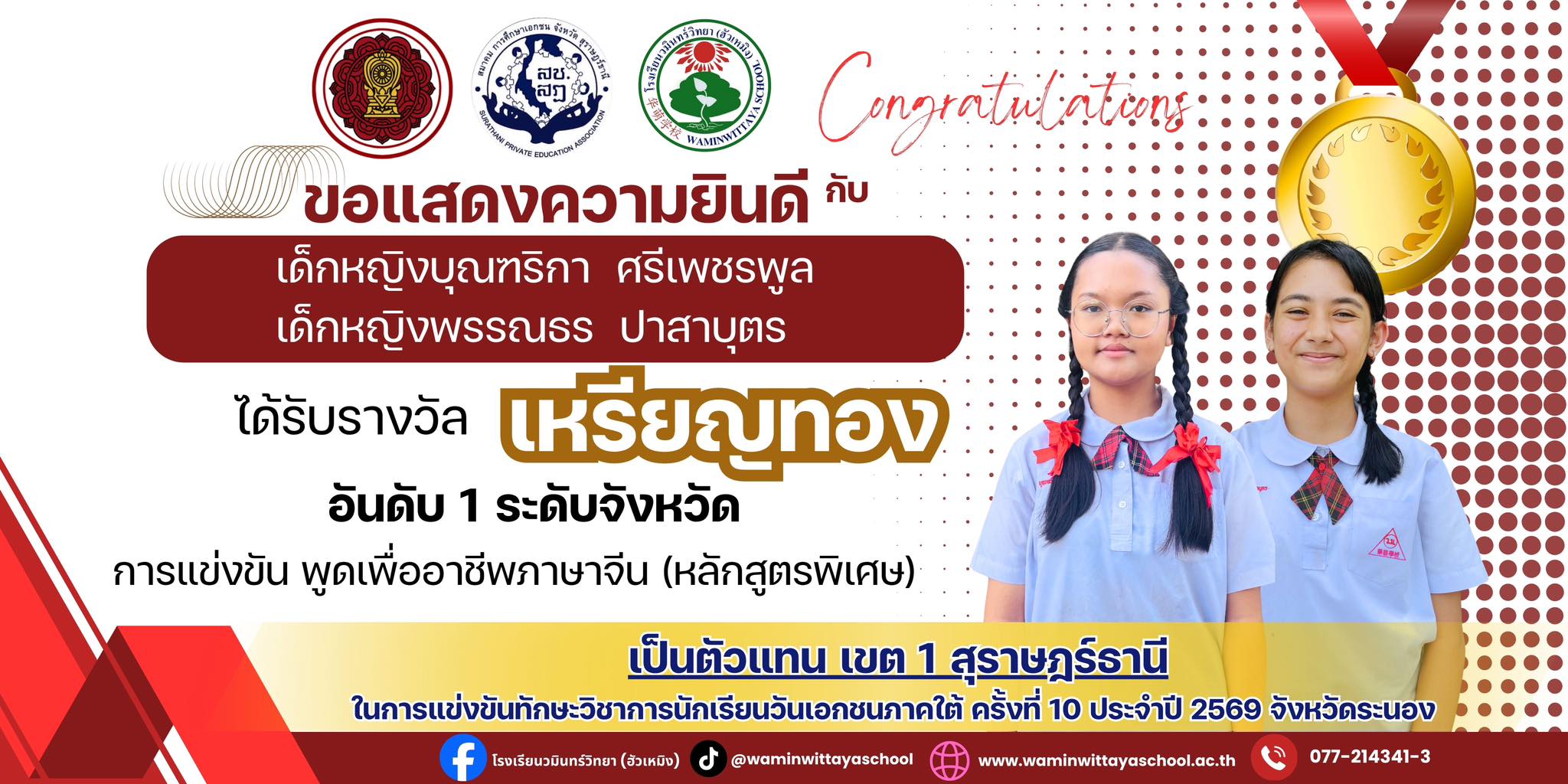 ขอแสดงความยินดีกับ เด็กหญิงบุณฑริกา ศรีเพชรพูล เด็กหญิงพรรณธร ปาสาบุตร นักเรียนที่ได้รางวัล เหรียญทอง อันดับ 1 ระดับจังหวัด การแข่งขัน พูดเพื่ออาชีพภาษาจีน (หลักสูตรพิเศษ) เป็นตัวแทน เขต 1 สุราษฎร์ธานี ในการแข่งขันทักษะวิชาการนักเรียนวันเอกชนภาคใต้ ครั้