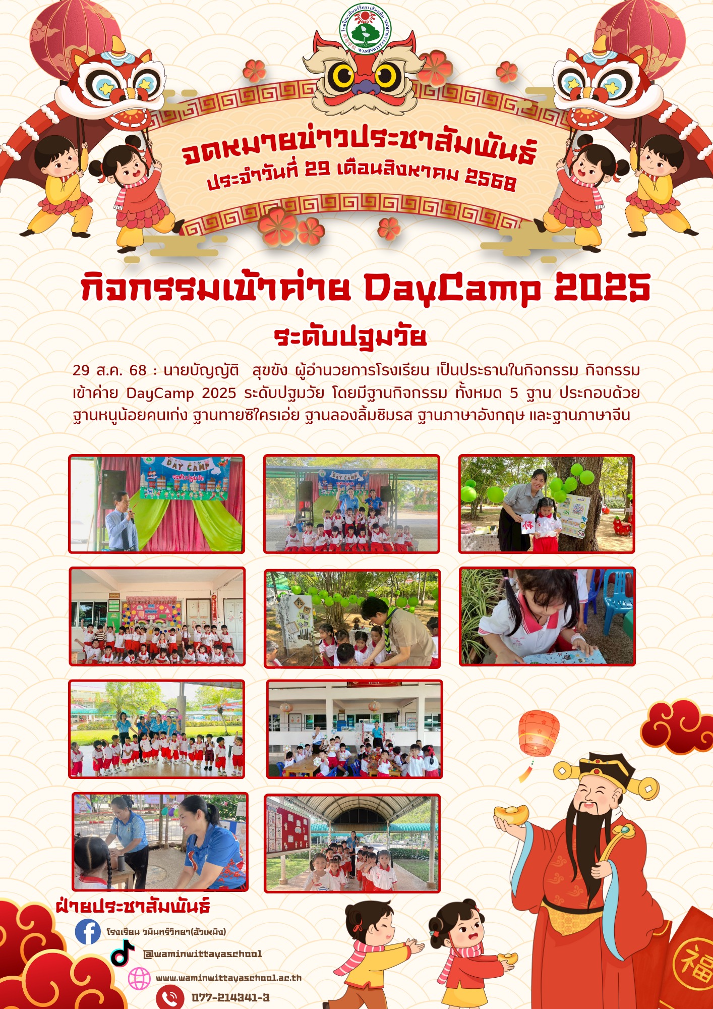 29 ส.ค. 68 : นายบัญญัติ สุขขัง ผู้อำนวยการโรงเรียน เป็นประธานในกิจกรรม กิจกรรมเข้าค่าย DayCamp 2025 ระดับปฐมวัย โดยมีฐานกิจกรรม ทั้งหมด 5 ฐาน ประกอบด้วย ฐานหนูน้อยคนเก่ง ฐานทายซิใครเอ่ย ฐานลองลิ้มชิมรส ฐานภาษาอังกฤษ และฐานภาษาจีน