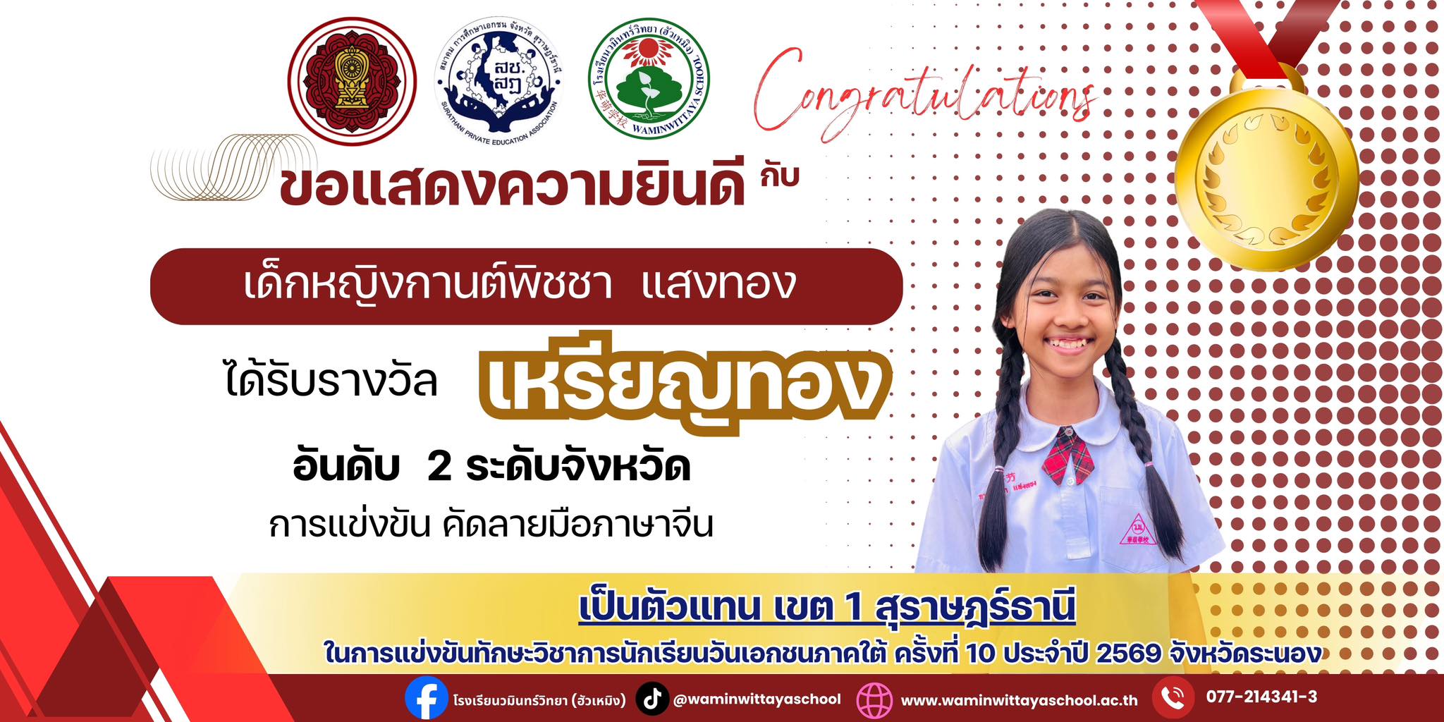 ขอแสดงความยินดีกับ เด็กหญิงกานต์พิชชา แสงทอง นักเรียนที่ได้รางวัล เหรียญทอง อันดับ 2 ระดับจังหวัด การแข่งขัน คัดลายมือภาษาจีน เป็นตัวแทน เขต 1 สุราษฎร์ธานี ในการแข่งขันทักษะวิชาการนักเรียนวันเอกชนภาคใต้ ครั้งที่ 10 ประจำปี 2569 จังหวัดระนอง
