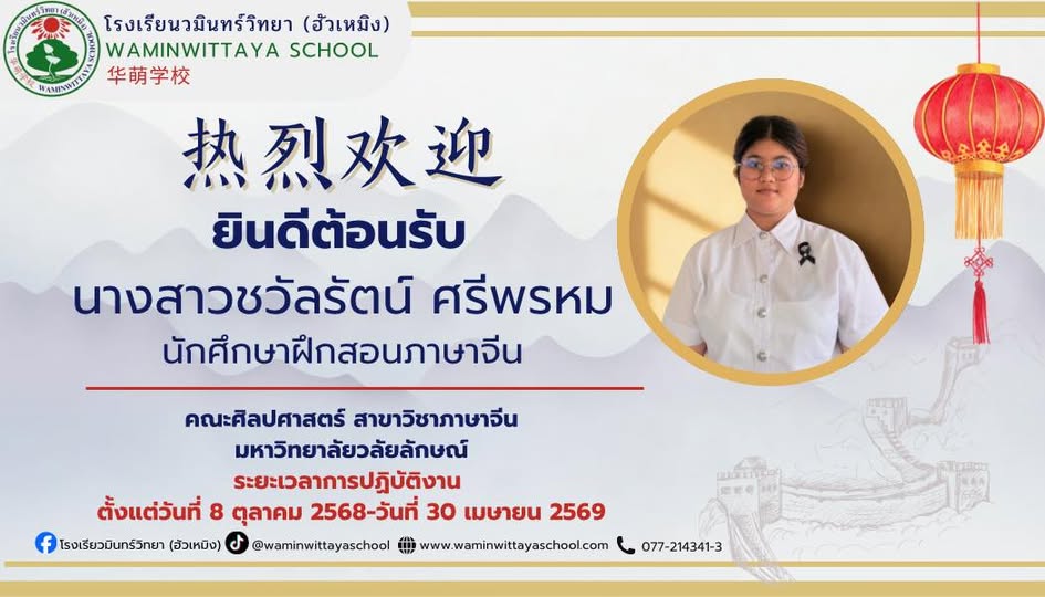 โรงเรียนวมินทร์วิทยา (ฮัวเหมิง) ยินดีต้อนรับ “นักศึกษาฝึกประสบการณ์วิชาชีพครู“ นางสาวชวัลรัตน์ ศรีพรหม จากคณะศิลปศาสตร์ สาขาวิชาภาษาจีน มหาวิทยาลัยวลัยลักษณ์