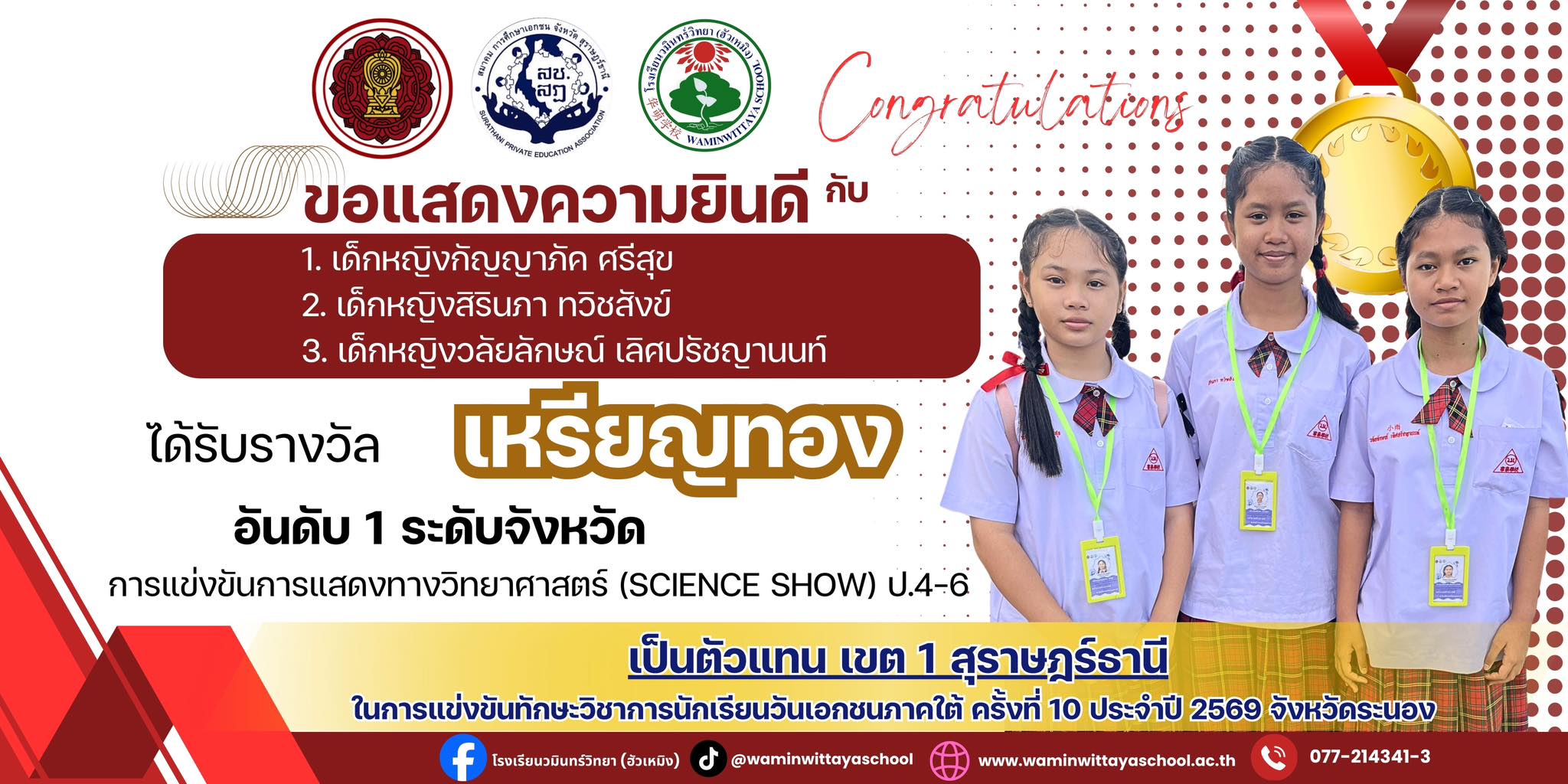 โรงเรียน วมินทร์วิทยา(ฮัวเหมิง) 华萌学校 ขอแสดงความยินดีกับ กลุ่มสาระวิทยาศาสตร์และเทคโนโลยี ระดับชั้นประถมศึกษาปีที่ 1-6 ได้รับรางวัลเหรียญเงินและเหรียญทองแดง ในโครงการทดสอบความสามารถทางวิชาการชิงแชมป์สุราษฎร์ธานี ประจำปีการศึกษา 2568