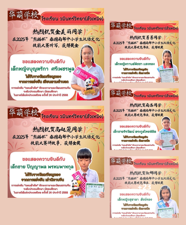 โรงเรียน วมินทร์วิทยา(ฮัวเหมิง) 华萌学校 ขอแสดงความยินดีกับ กลุ่มสาระภาษาไทย ระดับชั้นประถมศึกษาปีที่ 1-6 ได้รับรางวัลเหรียญทอง เหรียญเงินและเหรียญทองแดง ในโครงการทดสอบความสามารถทางวิชาการชิงแชมป์สุราษฎร์ธานี ประจำปีการศึกษา 2568