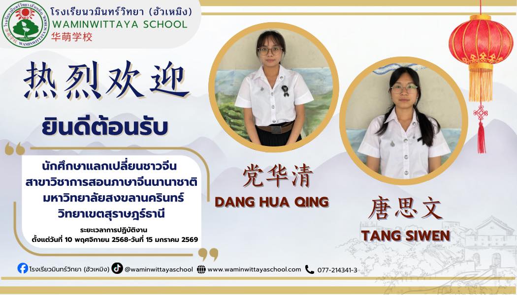 โรงเรียนวมินทร์วิทยา (ฮัวเหมิง) ยินดีต้อนรับ “นักศึกษาแลกเปลี่ยนชาวจีน 党华清 และ 唐思文 จากสาขาวิชาการสอนภาษาจีนนานาชาติ มหาวิทยาลัยสงขลานครินทร์ วิทยาเขตสุราษฎร์ธานี