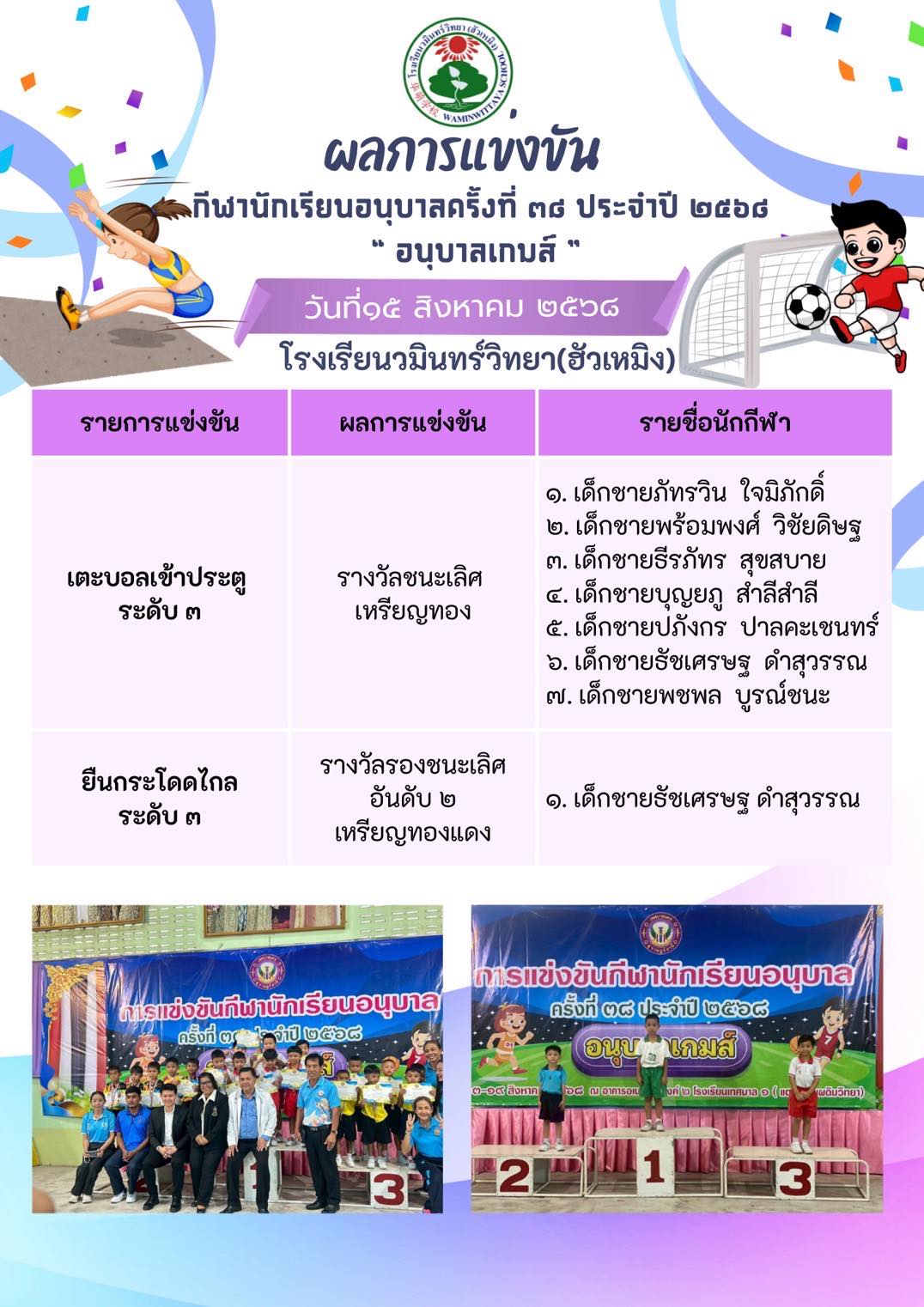 ร่วมส่งกำลังใจให้น้อง ๆ อนุบาล วมินทร์วิทยา(ฮัวเหมิง) ประกอบด้วย 3 รายการแข่งขัน - ฟุตบอล 7 คน ระดับอนุบาล 3 - ยืนกระโดดไกล ระดับอนุบาล 1-3 - โยนบอลลงห่วง ระดับอนุบาล 1-3 ในกีฬาอนุบาลนักเรียนโรงเรียนเอกชน จังหวัดสุราษฎร์ธานี ปีการศึกษา 2568 ณ โรงเรียนเทพม