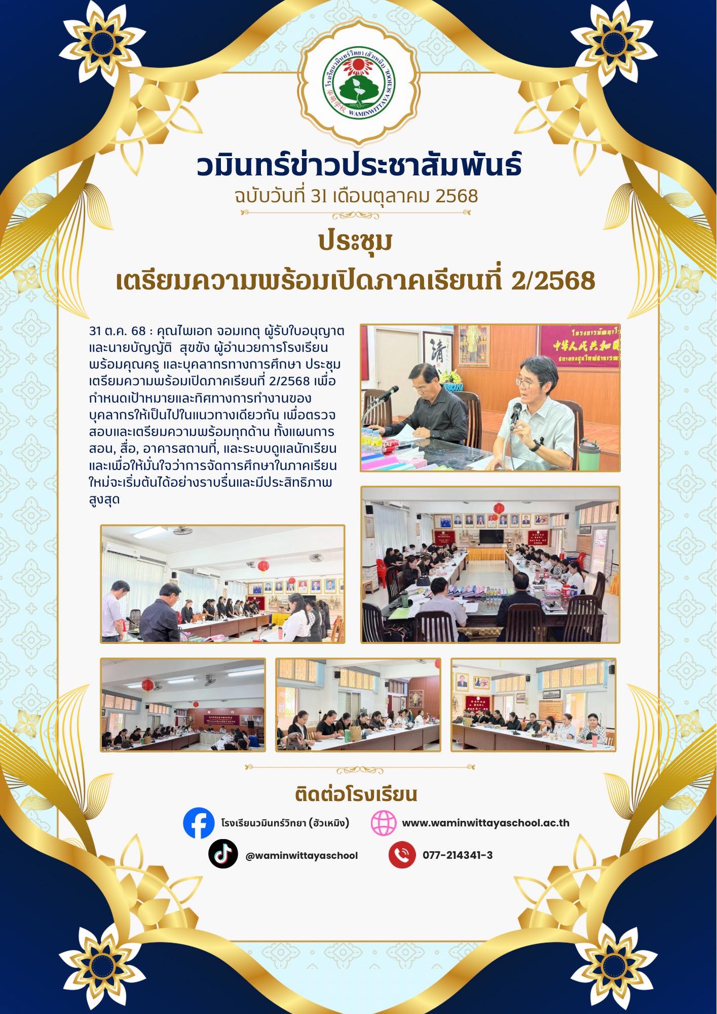 31 ต.ค. 68 : คุณไพเอก จอมเกตุ ผู้รับใบอนุญาต และนายบัญญัติ สุขขัง ผู้อำนวยการโรงเรียน พร้อมคุณครู และบุคลากรทางการศึกษา ประชุมเตรียมความพร้อมเปิดภาคเรียนที่ 2/2568