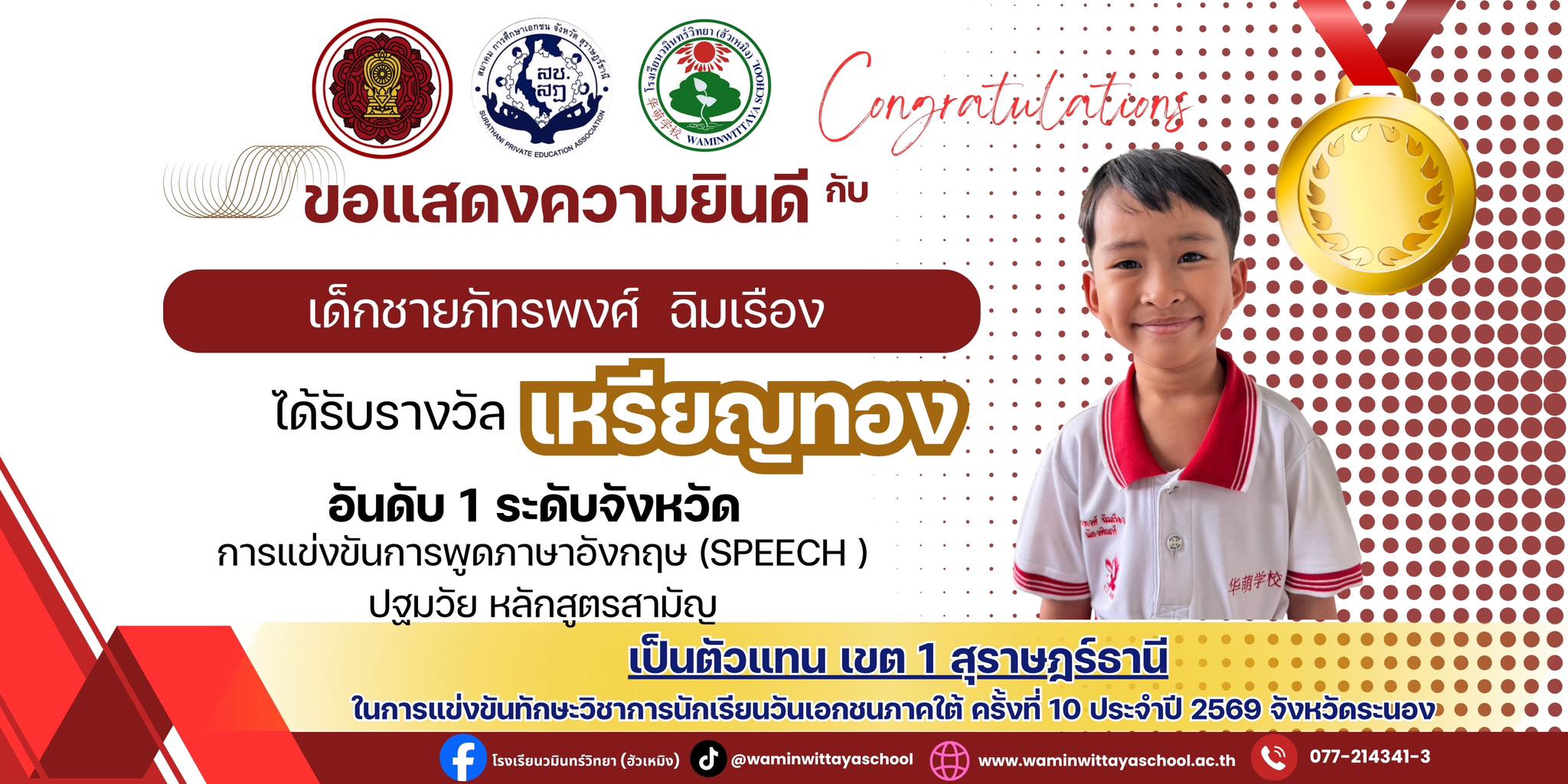 ขอแสดงความยินดีกับ เด็กชายภัทรพงศ์ ฉิมเรือง นักเรียนที่ได้รางวัล เหรียญทอง อันดับ 1 ระดับจังหวัด การแข่งขันการพูดภาษาอังกฤษ (Speech ) ปฐมวัย หลักสูตรสามัญ เป็นตัวแทน เขต 1 สุราษฎร์ธานี ในการแข่งขันทักษะวิชาการนักเรียนวันเอกชนภาคใต้ ครั้งที่ 10 ประจำปี 25