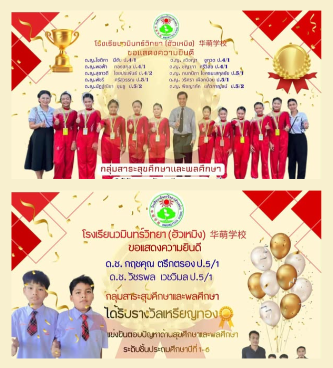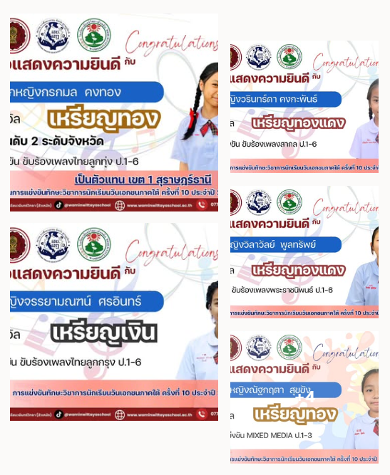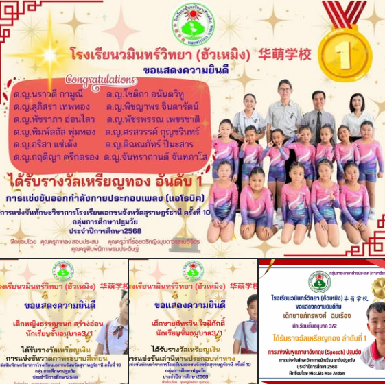 โรงเรียน วมินทร์วิทยา(ฮัวเหมิง) 华萌学校 ขอแสดงความยินดีกับ กลุ่มสาระภาษาไทย ระดับชั้นประถมศึกษาปีที่ 1-6 ได้รับรางวัลเหรียญทอง เหรียญเงินและเหรียญทองแดง ในโครงการทดสอบความสามารถทางวิชาการชิงแชมป์สุราษฎร์ธานี ประจำปีการศึกษา 2568
