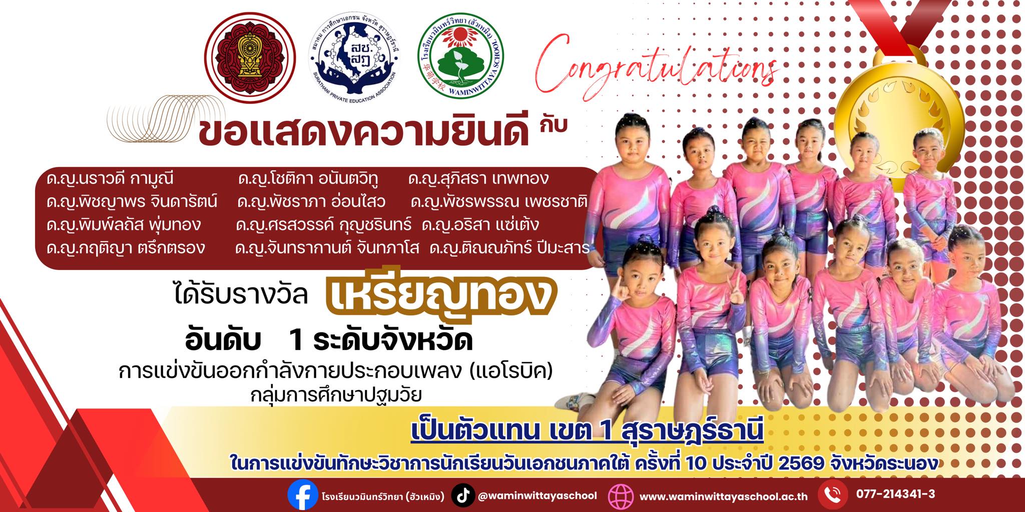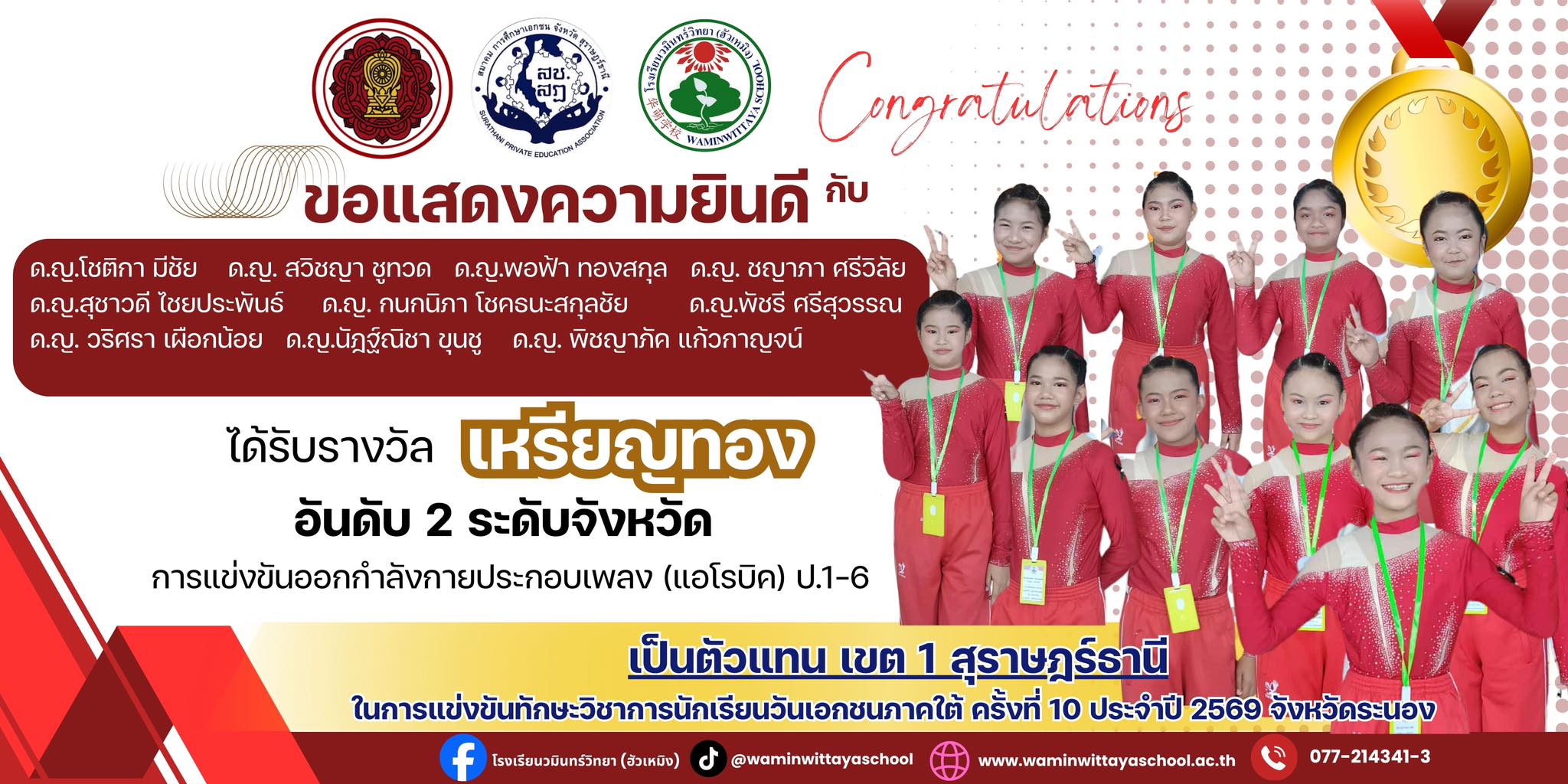 ขอแสดงความยินดีกับนักเรียนที่ได้รางวัล เหรียญทอง อันดับ 2 ระดับจังหวัด การแข่งขันออกกำลังกายประกอบเพลง (แอโรบิค) ป.1-6 เป็นตัวแทน เขต 1 สุราษฎร์ธานี ในการแข่งขันทักษะวิชาการนักเรียนวันเอกชนภาคใต้ ครั้งที่ 10 ประจำปี 2569 จังหวัดระนอง
