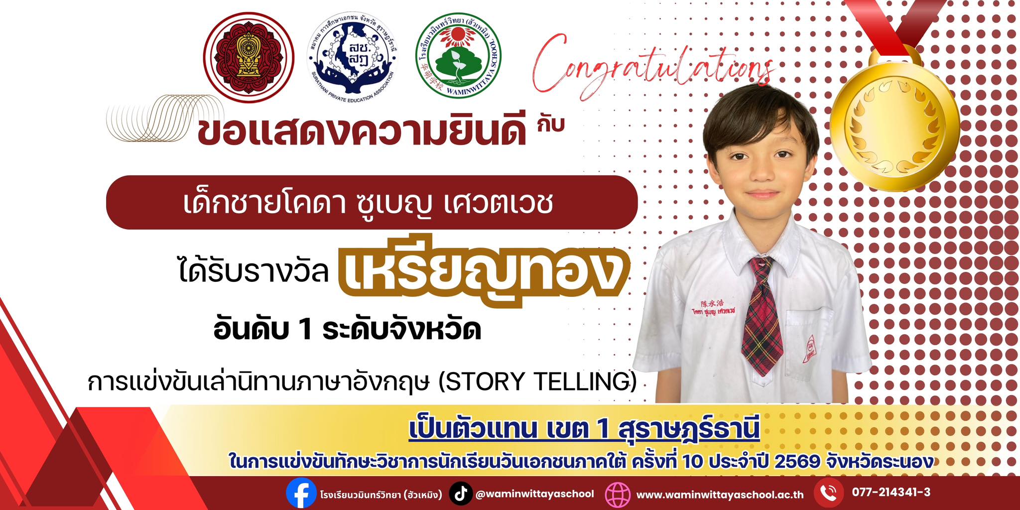 ขอแสดงความยินดีกับ เด็กชายโคดา ซูเบญ เศวตเวช นักเรียนที่ได้รางวัล เหรียญทอง อันดับ 1 ระดับจังหวัด การแข่งขันเล่านิทานภาษาอังกฤษ (Story Telling) เป็นตัวแทน เขต 1 สุราษฎร์ธานี ในการแข่งขันทักษะวิชาการนักเรียนวันเอกชนภาคใต้ ครั้งที่ 10 ประจำปี 2569 จังหวัดระ