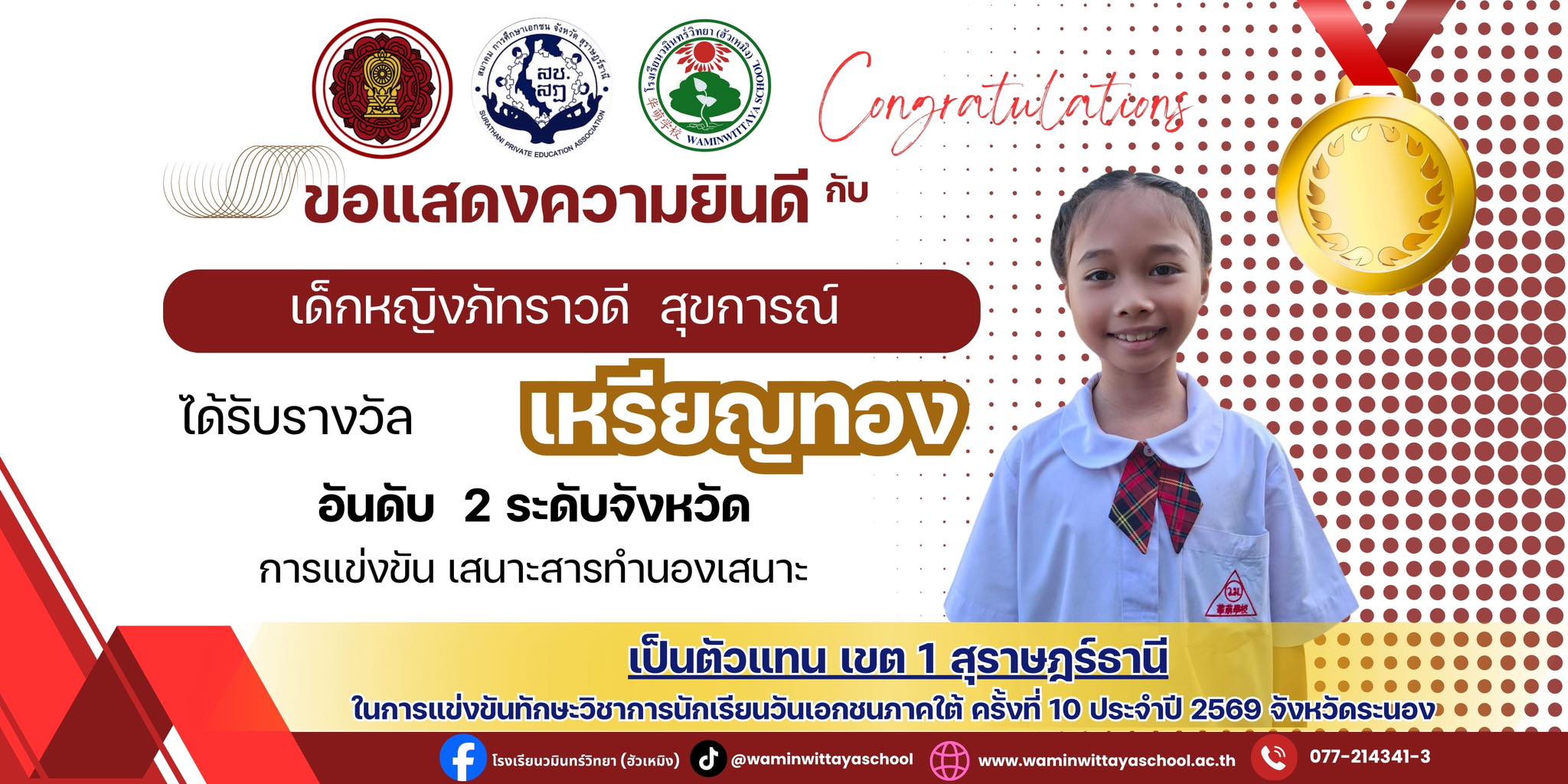 ขอแสดงความยินดีกับ เด็กหญิงภัทราวดี สุขการณ์ นักเรียนที่ได้รางวัล เหรียญทอง อันดับ 2 ระดับจังหวัด การแข่งขัน เสนาะสารทำนองเสนาะ เป็นตัวแทน เขต 1 สุราษฎร์ธานี ในการแข่งขันทักษะวิชาการนักเรียนวันเอกชนภาคใต้ ครั้งที่ 10 ประจำปี 2569 จังหวัดระนอง