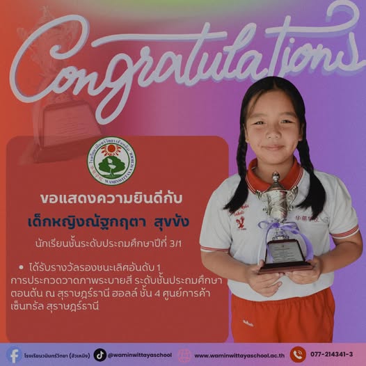 โรงเรียนวมินทร์วิทยา (ฮัวเหมิง) ขอแสดงความยินดีกับ เด็กหญิงณัฐกฤตา สุขขัง นักเรียนชั้นระดับประถมศึกษาปีที่ 3/1 ได้รับรางวัลรองชนะเลิศอันดับ 1 การประกวดวาดภาพระบายสี ระดับชั้นประถมศึกษาตอนต้น ณ สุราษฎร์ธานี ฮอลล์ ชั้น 4 ศูนย์การค้าเซ็นทรัล สุราษฎร์ธานี