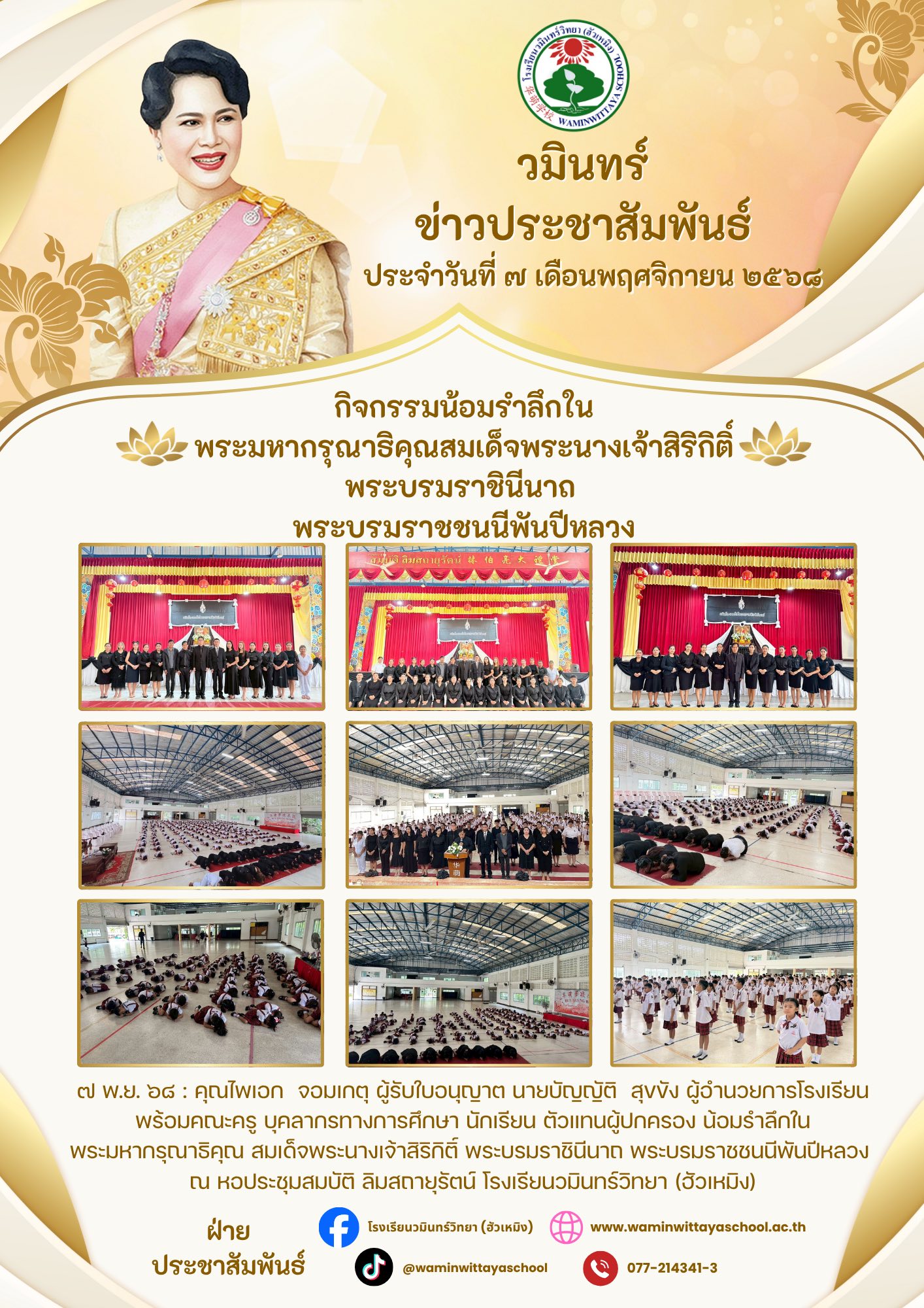 ๗ พ.ย. ๖๘ : คุณไพเอก จอมเกตุ ผู้รับใบอนุญาต นายบัญญัติ สุขขัง ผู้อำนวยการโรงเรียน พร้อมคณะครู บุคลากรทางการศึกษา นักเรียน ตัวแทนผู้ปกครอง น้อมรำลึกในพระมหากรุณาธิคุณ สมเด็จพระนางเจ้าสิริกิติ์ พระบรมราชินีนาถ พระบรมราชชนนีพันปีหลวง ณ หอประชุมสมบัติ ลิมสถ