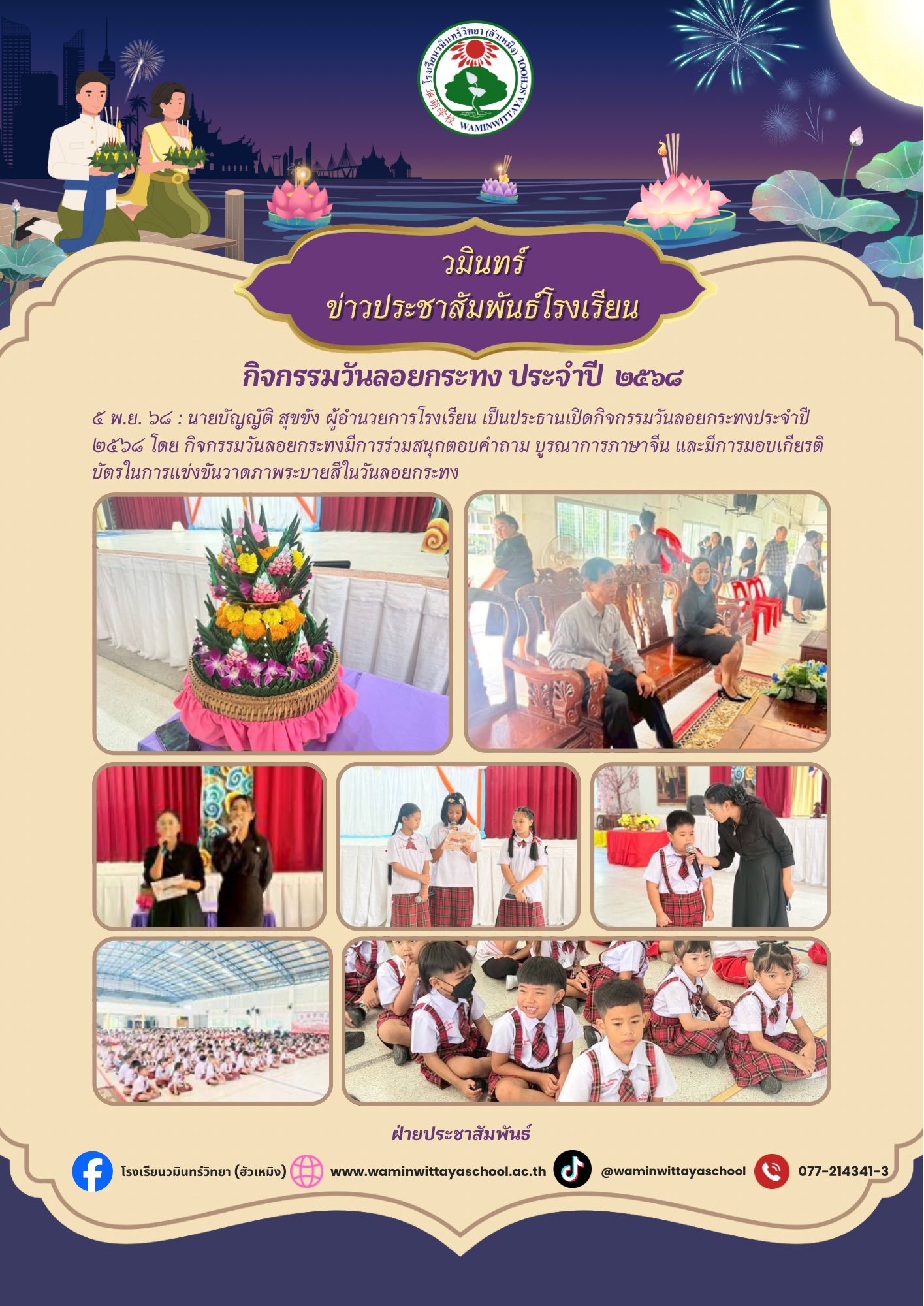 ๕ พ.ย. ๖๘ : นายบัญญัติ สุขขัง ผู้อำนวยการโรงเรียน เป็นประธานเปิดกิจกรรมวันลอยกระทงประจำปี ๒๕๖๘ โดย กิจกรรมวันลอยกระทงมีการร่วมสนุกตอบคำถาม บูรณาการภาษาจีน และมีการมอบเกียรติบัตรในการแข่งขันวาดภาพระบายสีในวันลอยกระทง